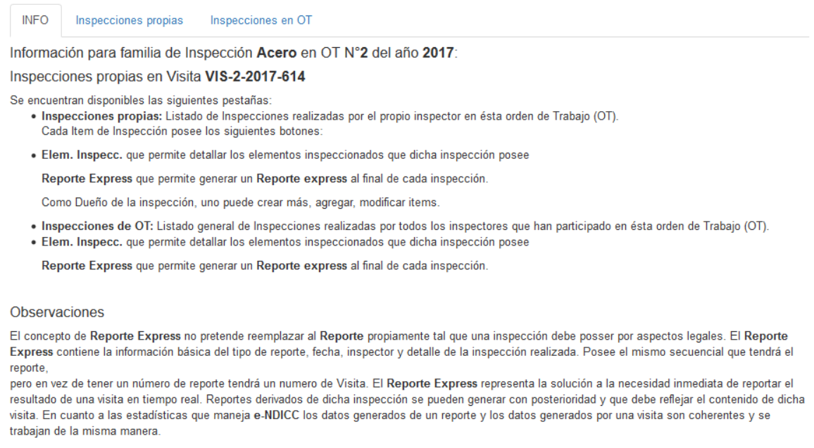 La pestaña INFO a nivel de INSPECCIONES muestra la orden Actual , la inspección actual y luego la descripción de las pestañas de éste nivel, tal como se muestra en la siguiente figura