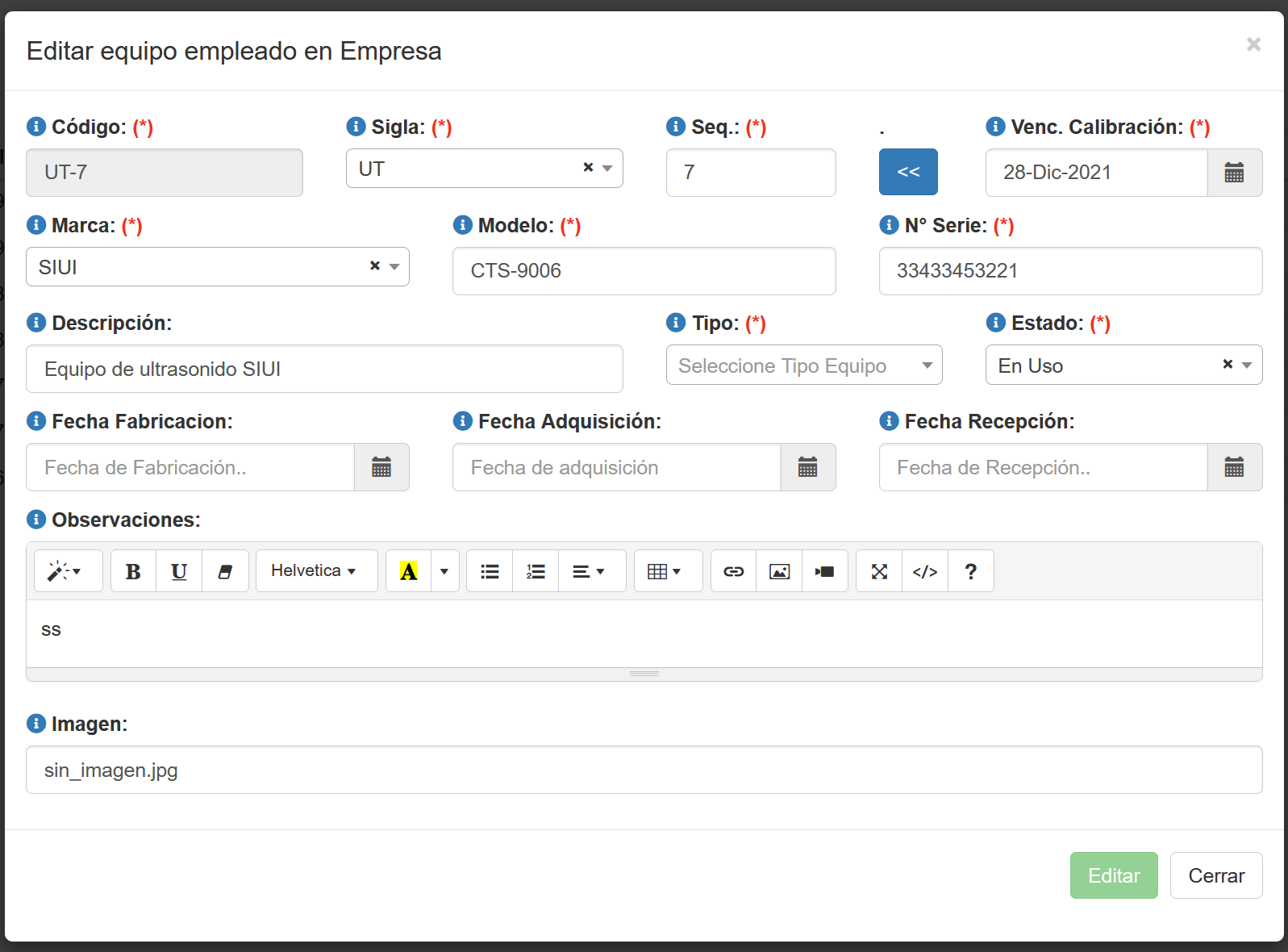 Al seleccionar el botón Crear/Editar, aparecerá una ventana emergente con datos para Crear(en blanco) o Editar (con datos de la respectiva fila) tal como se muestra a continuación.