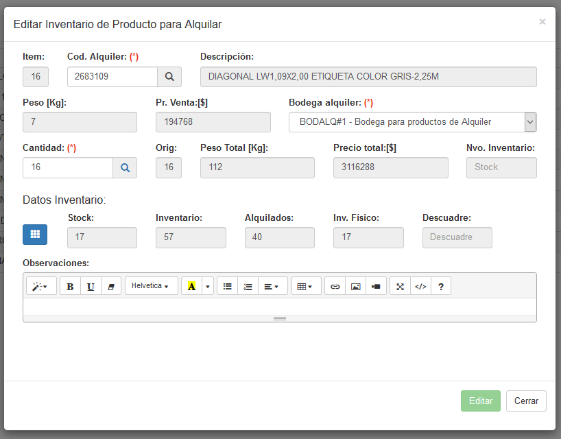 Una vez seleccionado el producto, mostrarán los datos de inventario del Producto de acuerdo a lo especificado en Control de Alquiler