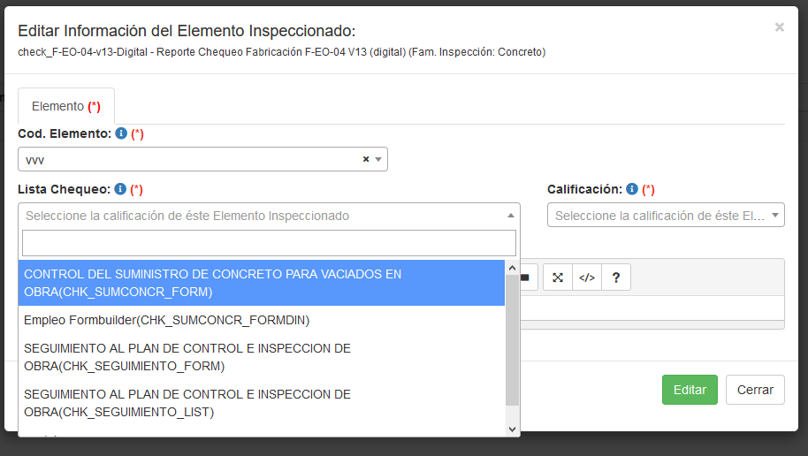 Fig 511 Ventana emergente para asociar elemento con formulario tipo checklist