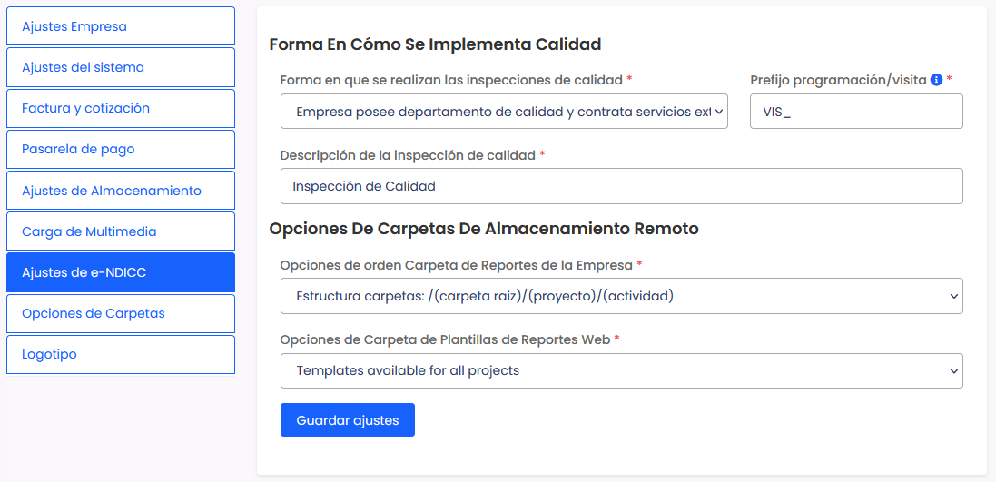 Sistema e-NDICC-ERP/Cuenta Administrador/Configuración/Configuración Empresa/Ajustes de e-NDICC