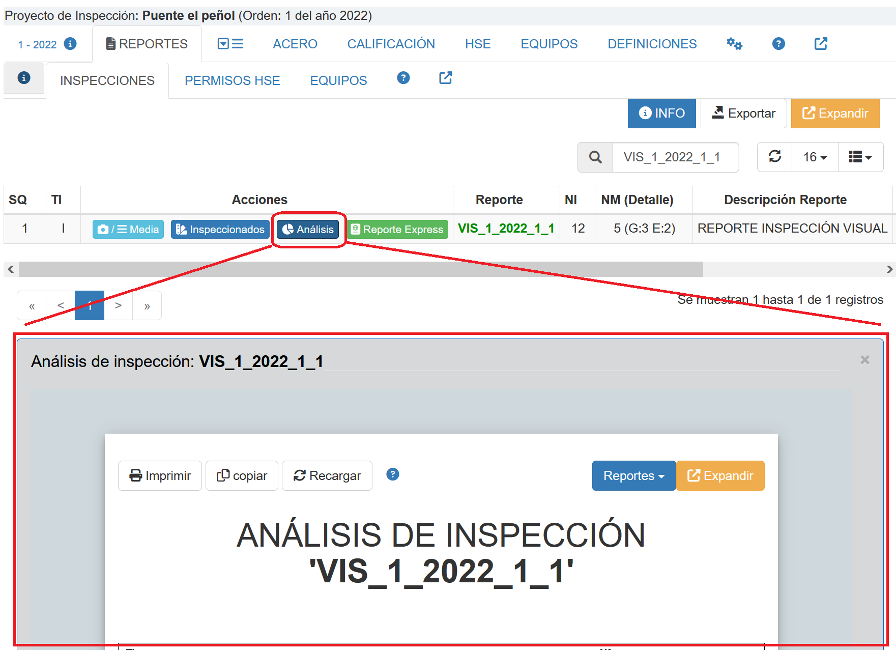 Fig 246 Extracto de Pantalla con detalle de reporte Análisis de inspección de un determinado reporte de inspección.