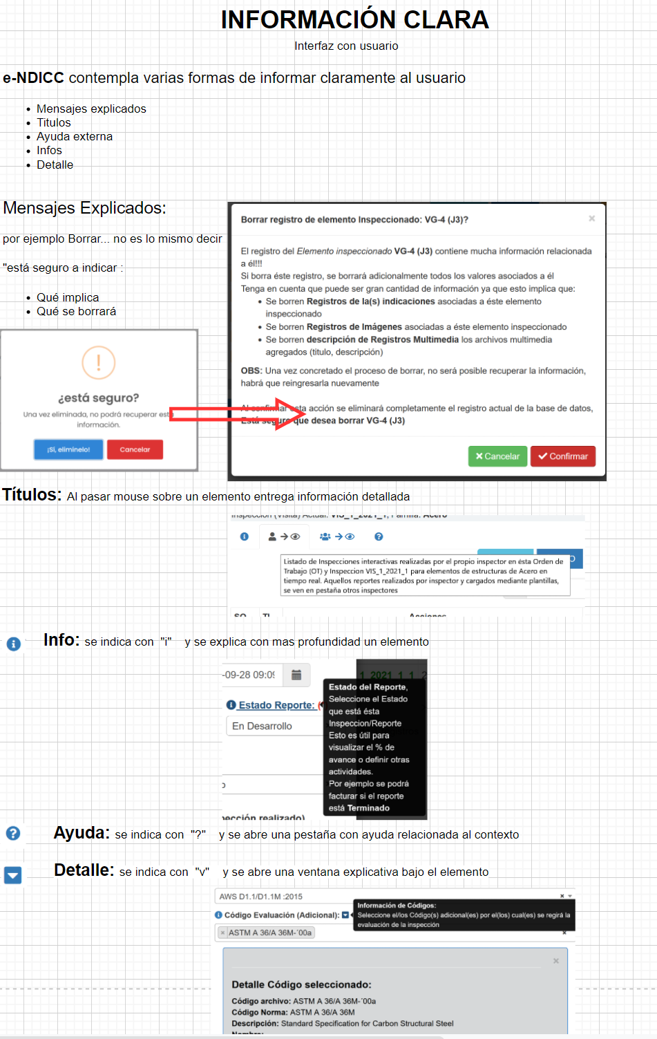 Junto con emplear diversos elementos gráficos que facilitan la vida al usuario, se tiene especial cuidado con aquellos elementos que implican una acción, para ello se informa al usuario, con los siguientes elementos