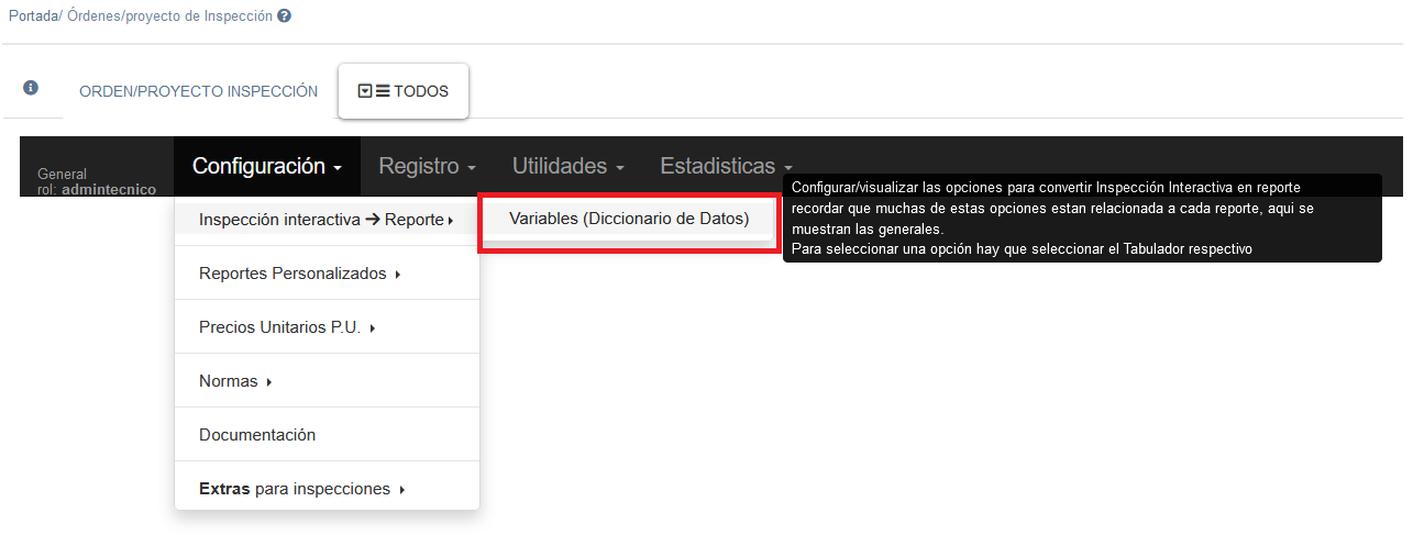 Durante el proceso de transformación de Inspección interactiva a Reporte se emplea una serie de variables las cuales permiten completar la plantilla que normalmente se emplea con los datos de la inspección actual. Estas se agrupan en un listado que se denomina Catálogo de variables o Diccionario de Datos.