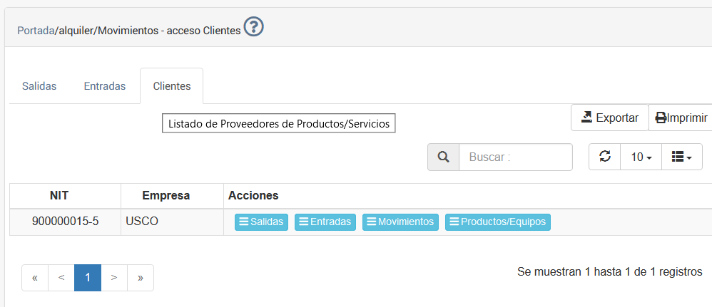 Esta opción se presenta al seleccionar la Pestaña "CLIENTES" de la opción de menú Alquilar, se presenta una tabla de datos que contiene los movimientos de Alquiler de equipo desde la perspectiva del cliente actual y sus respectivas opciones, tal como se muestra en la imagen a continuación.