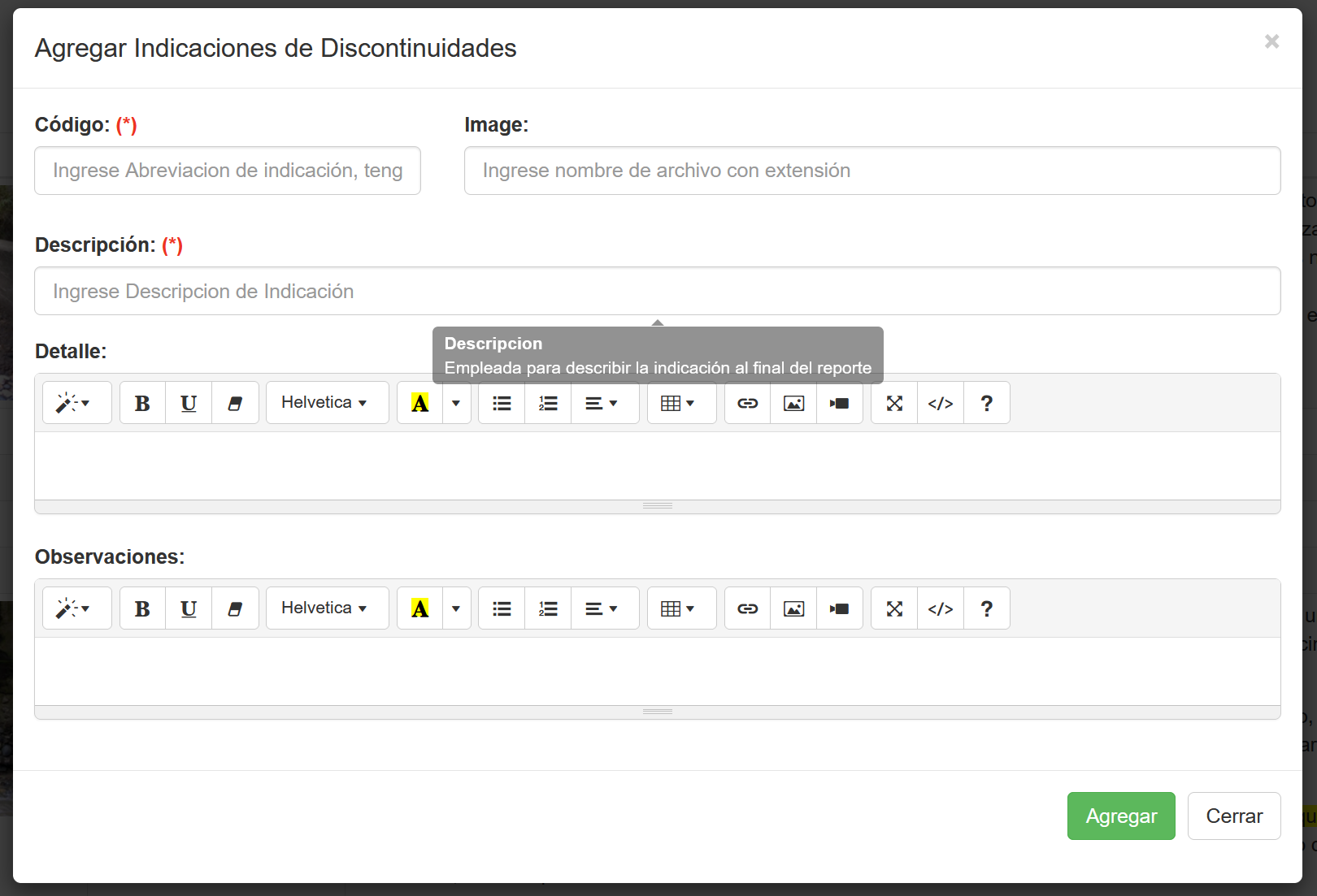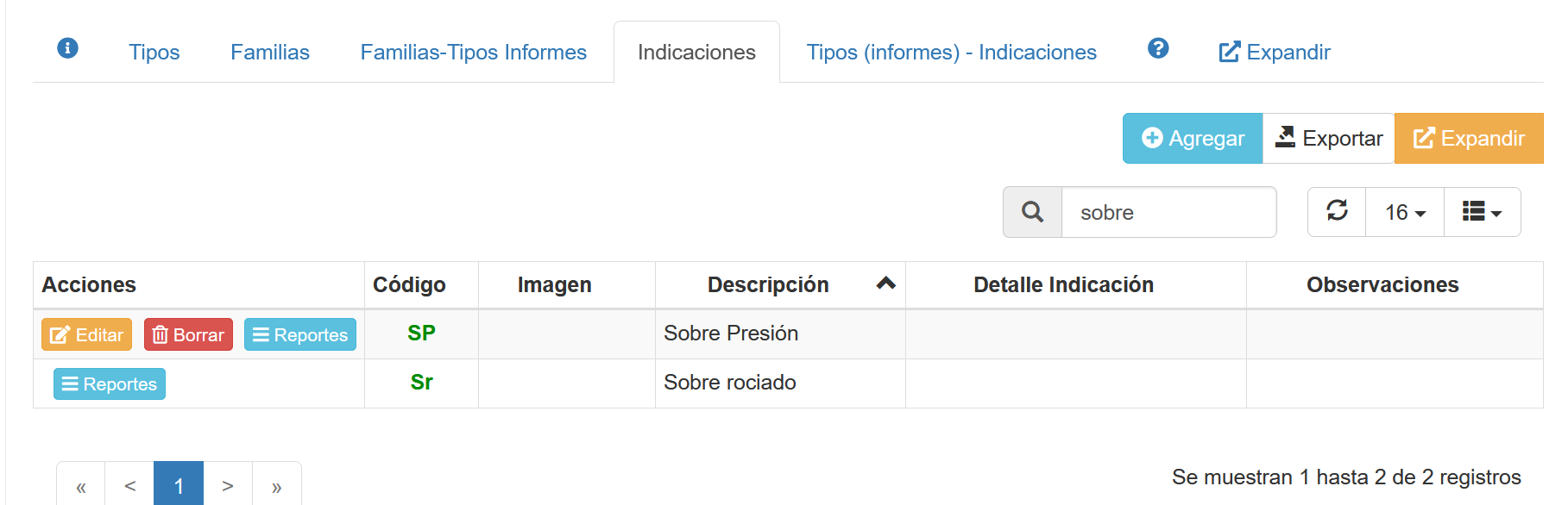 una vez que se ha creado una indicación personalizada.. esta aparecerá en el listado de indicaciones con los botones Editar/borrar, las demás indicaciones,que no tienen estos botones son de caracter general y están ya definidas en el sistema.