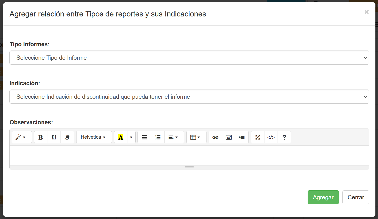 Al seleccionar la opción crear (nuevo valor) aparece una ventana emergente en blanco que permite establecer la relación entre el tipo de reporte y sus indicaciones, tal como se muestra en la figura
