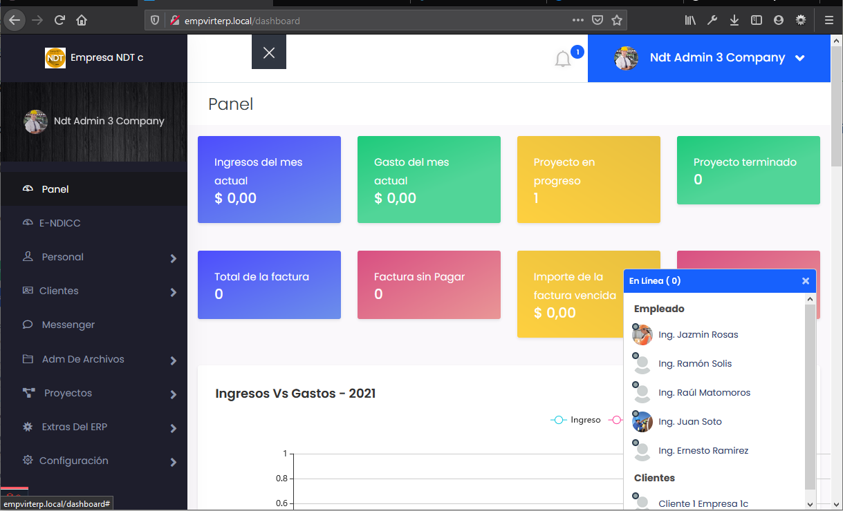 Al ingresar al sistema el usuario normalmente se encontrará con un panel con una serie de indicadores y gráficos de como va evolucionando la empresa, tal como se muestra a continuación
