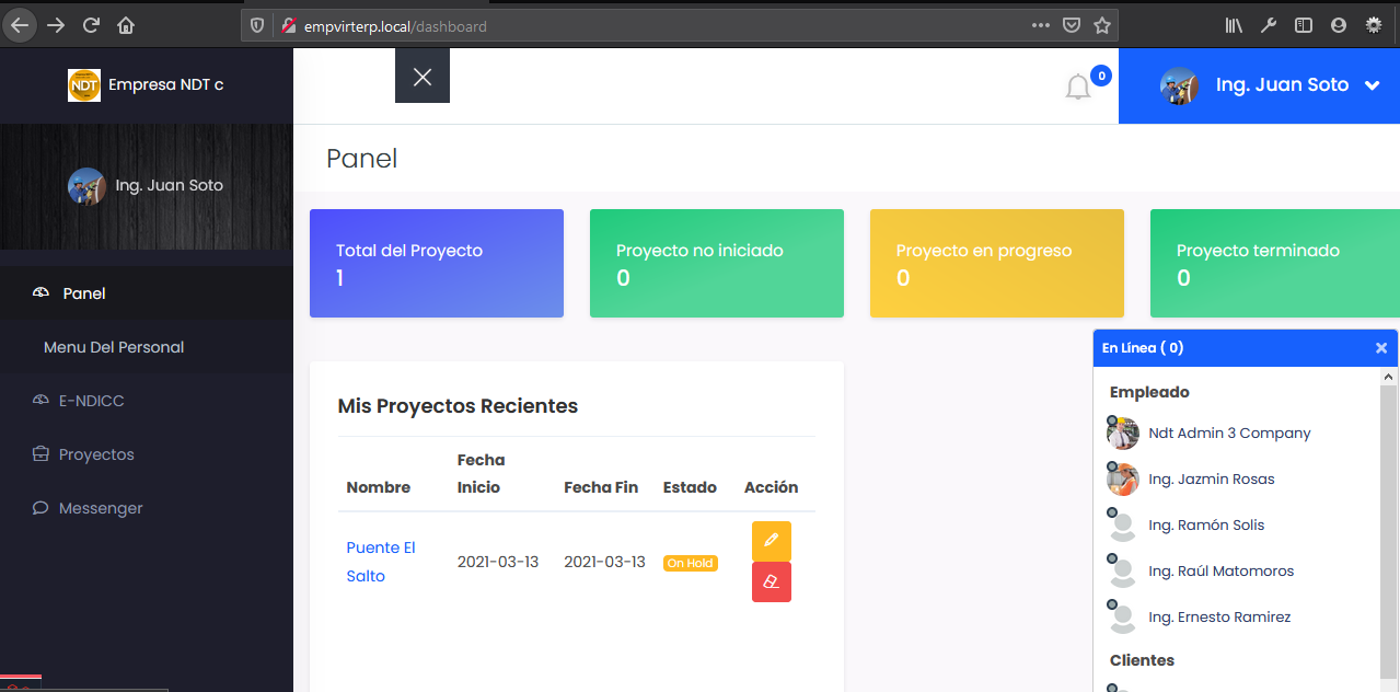 Una vez se registra el usuario, lo primero que visualiza un panel con indicadores. En este caso puntual, el inspector es parte de un proyecto y los indicadores le indican el estado de avance. También se aprecia que el chat está activo y el se puede comunicar con usuarios y clientes
