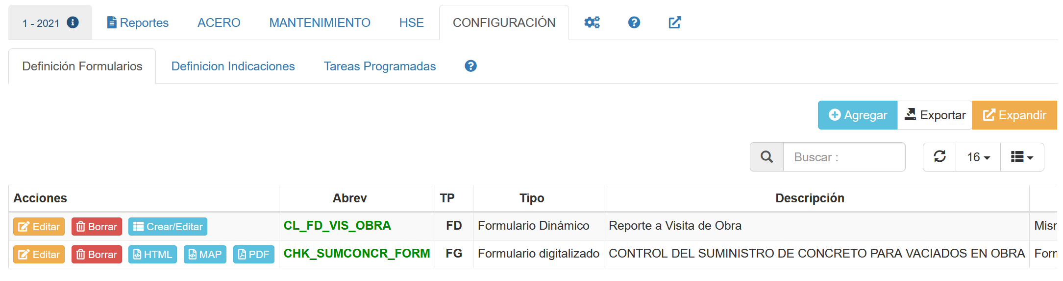 Una vez definido el formulario se genera un listado con una referencia al formulario HTML. Dependiendo del tipo de formulario, Digital (FG) o Dinámico (FD) seleccionado, se activarán diversos botones.