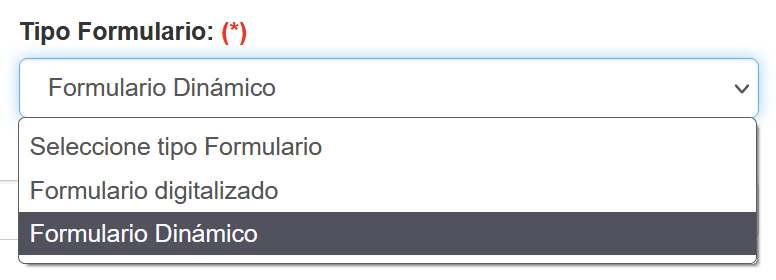 Al crear, modificar es posible visualizar el tipo de formulario a crear, tal como se muestra en la imagen a continuación