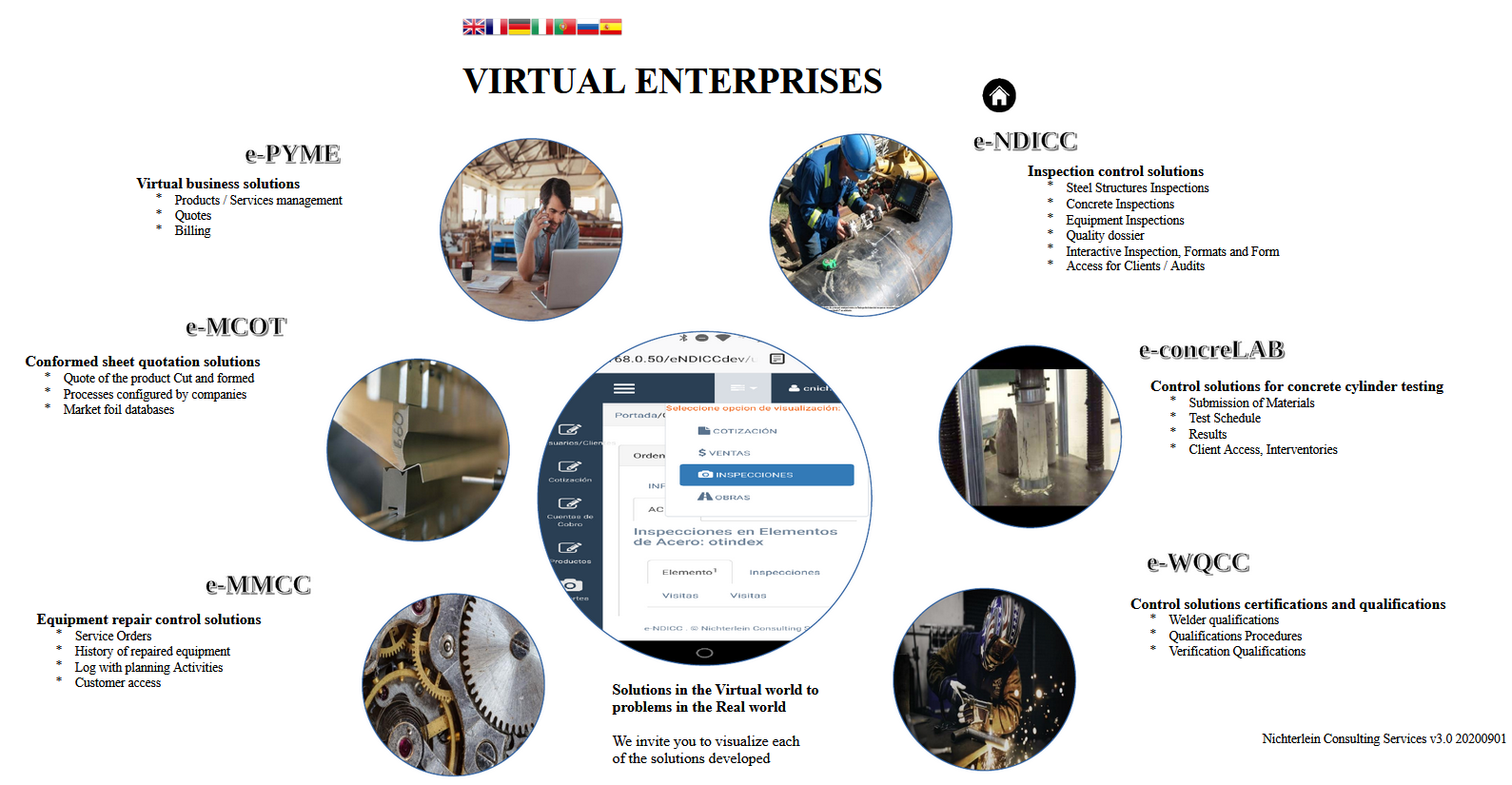 En esta página se muestra una infografía con una serie de círculos. Cada circulo representa un módulo desarrollado. Al seleccionar un determinado circulo, se va a la página del producto. El idioma del texto de esta infografía se puede modificar seleccionando las banderas representativa de los idiomas que se quiera ver (más detalles, ver selección de Idiomas)
