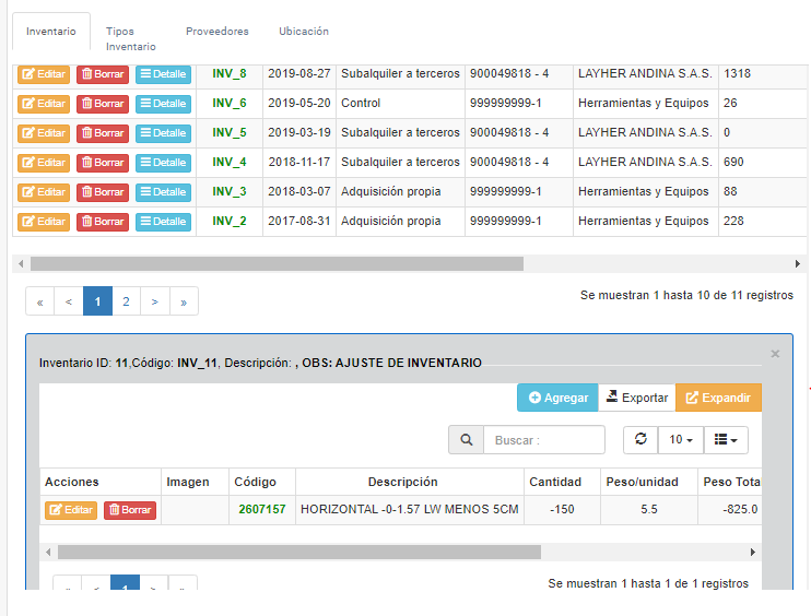 Esta opción se presenta al seleccionar el botón "Detalle" de la presenta la tabla de datos de los Inventarios realizados. Al seleccionarlo se presenta una tabla de datos que los productos que entran nuevamente al sistema, tal como se muestra en la imagen a continuación.