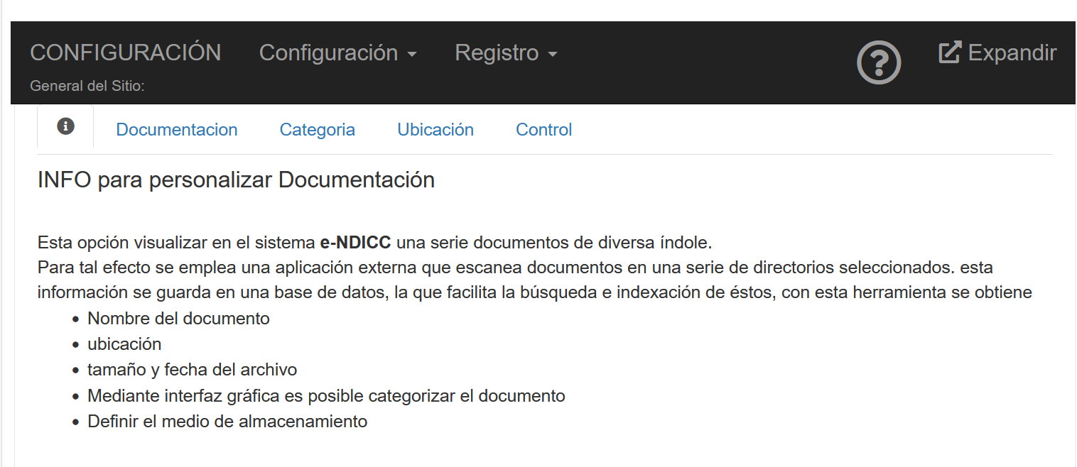 Fig 529 Extracto de pantalla, con menú de configuración opción Documentación seleccionado.