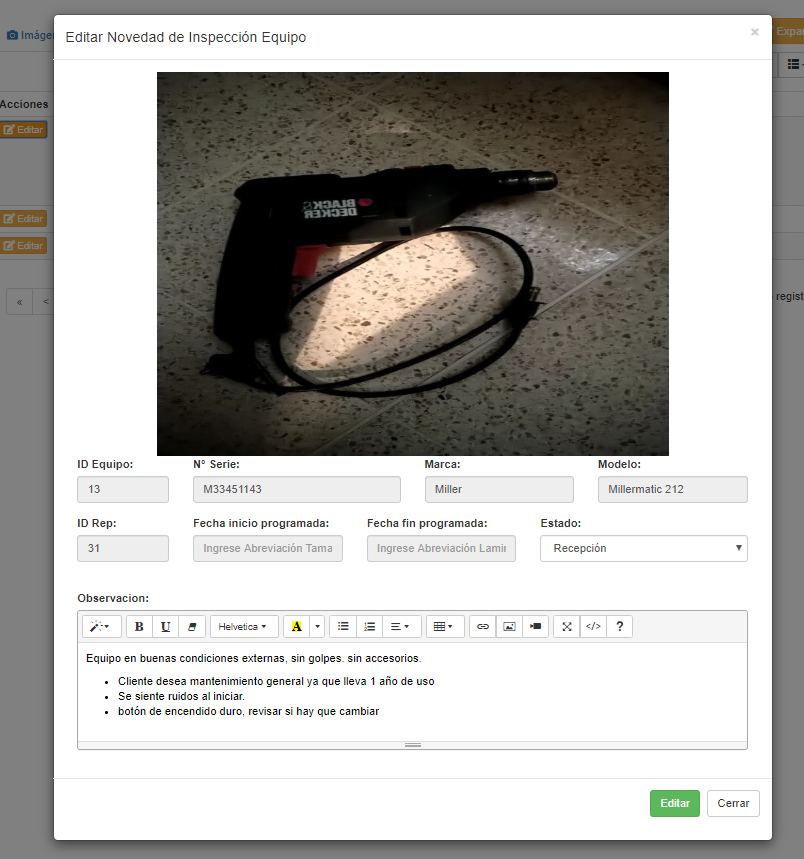 Imágenes son empleadas para documentar el estado de un equipo en las distintas etapas asociadas a una reparación. Por tal razón los parámetros empleados son Descripción de la imagen y estado de la reparación. Más detalles en