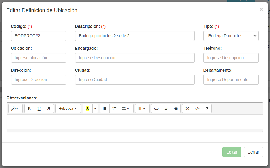 Al presionar el botón EDITAR un un determinado ítem de ubicación, aparece una pantalla con información del detalle de la ubicación, tal como se muestra en la imagen a continuación