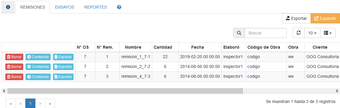 Remisión Familia de Inspección - ENSAYOS DE CILINDROS DE CONCRETO/ Remisión Al seleccionar ésta opción, se muestra un listado de las remisiones de esta orden de Trabajo/Obra. Fig 297 Listado de ensayos de Remisiones de ensayos de cilindros de Concreto.