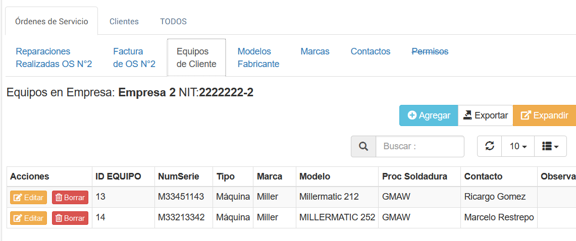 Al seleccionar la opción Equipos Empleados por el Cliente aparecerá una imagen similar a la siguiente