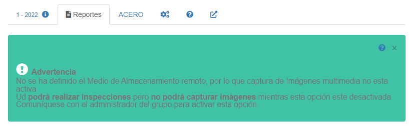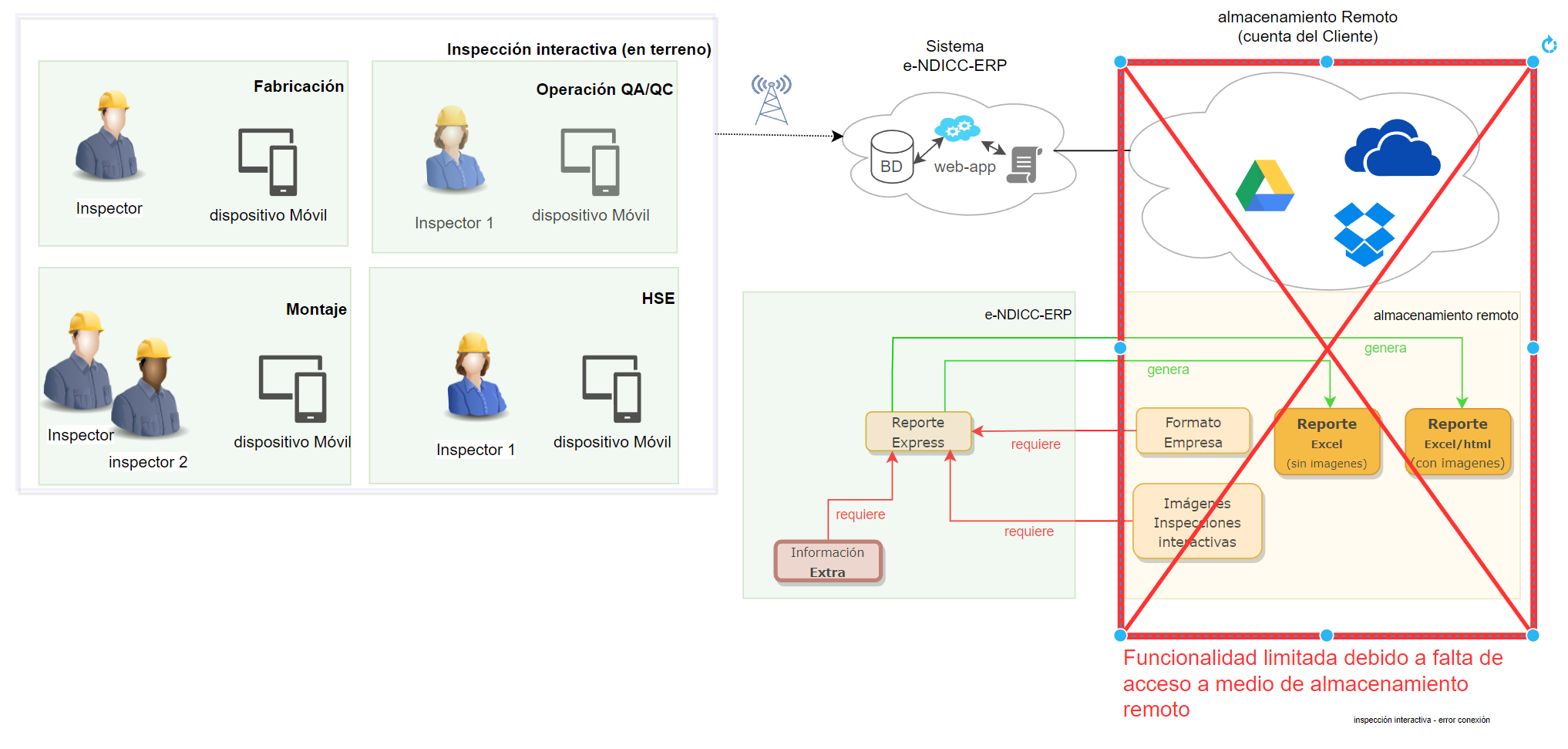 Durante la inspección Interactiva el sistema e-NDICC-ERP hace uso del medio de almacenamiento remoto definido por el cliente para almacenar directamente información. El no haber disponibilidad a esta funcionalidad afectará el funcionamiento de ciertas funciones, tal como se muestra en la imagen a continuación.