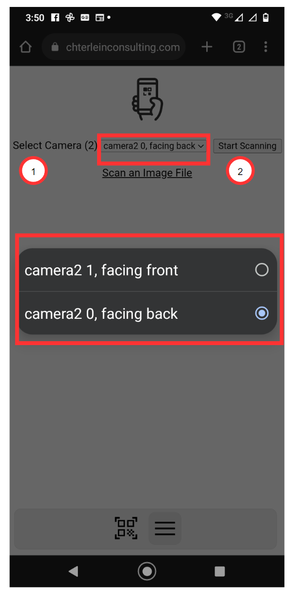 - Se selecciona la camara , el programa detecta las cámaras disponibles del dispositivo y las enumera. Al seleccionarlas es posible continuar con el escaneo