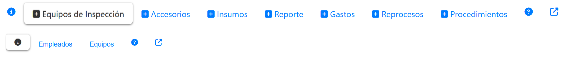 Fig 769 Detalle de opciones (pestañas en segundo nivel) luego de haber seleccionado la pestaña de extras "Equipos de inspección".