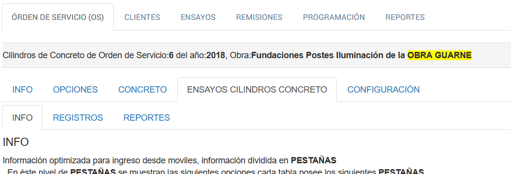 Permite visualizar un nuevo nivel de pestañas en donde será posible visualizar con mayor facilidad los ensayos de dicha una Orden de Servicio u obra que son extraídas las muestras. Ver más detalles en Pestaña Ordenes de Servicio