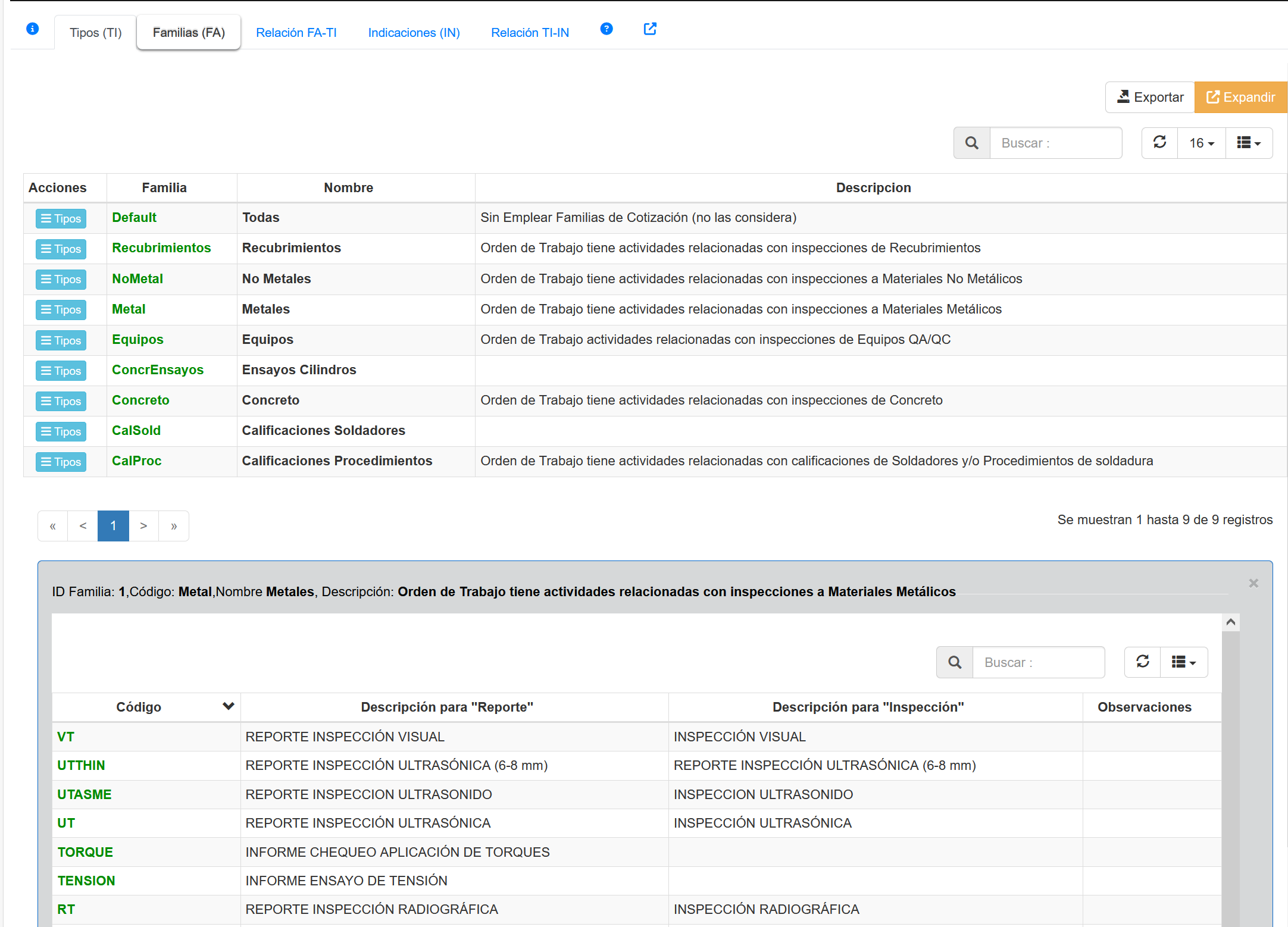 Esta opción se activa al seleccionar la pestaña Familias (FA), con lo que aparece una pantalla tal como se muestra a continuación.