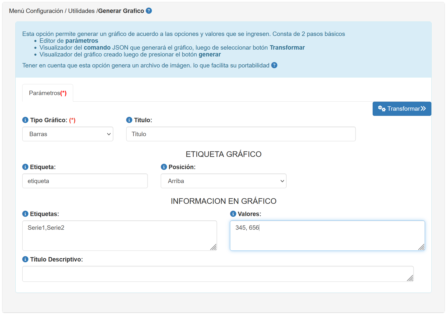 Luego de definir los parámetros principales del gráfico, hay que presionar botón Transformar para generar codigo JSON, tal como se muestra a continuación