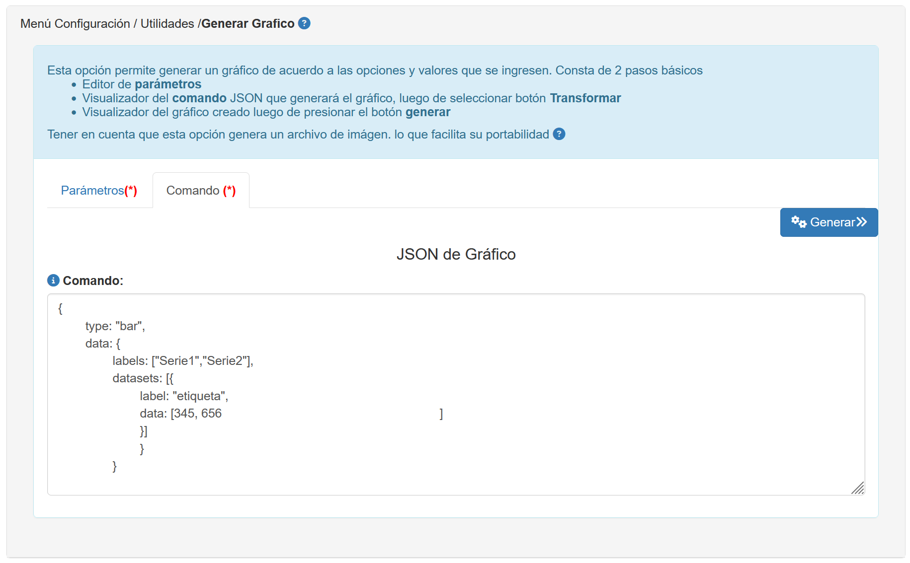 Fig 561 Extracto de pantalla Generador de Gráficos, Segunda pestaña "comando" con definición del comando JSON para generar gráfico