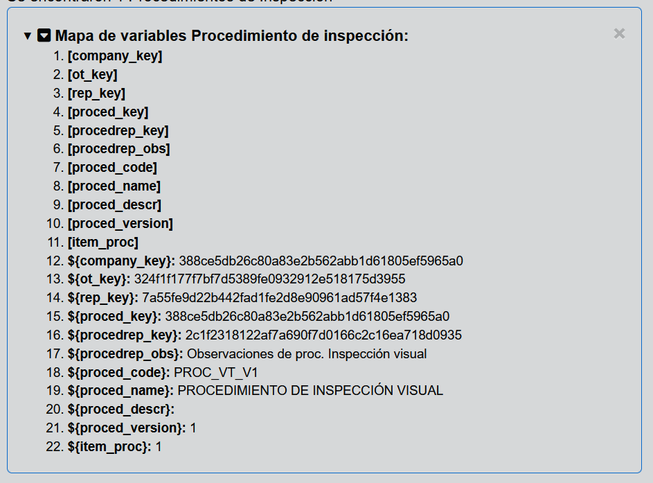 Fig 681 Extracto de pantalla, describiendo las variables del procedimiento de inspección.