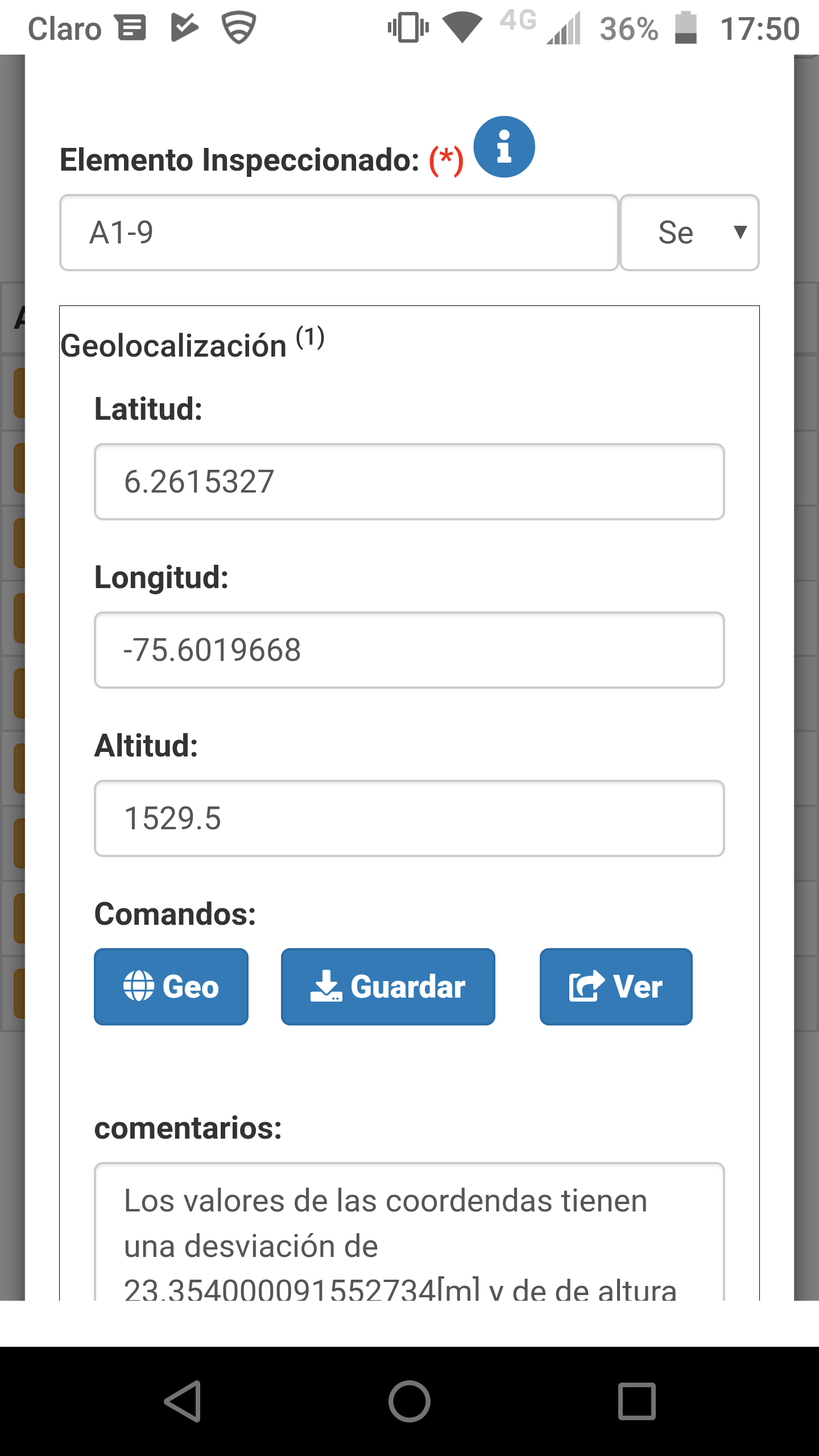 Si la inspección se realiza con dispositivos móviles dotados de GPS, es posible registrar en forma automática la ubicación del punto inspeccionado mediante uso de Geolicalización. Para Tal efecto, solamente es necesario ubicarse cerca del elemento a inspeccionar y presionar el botón "GEO"