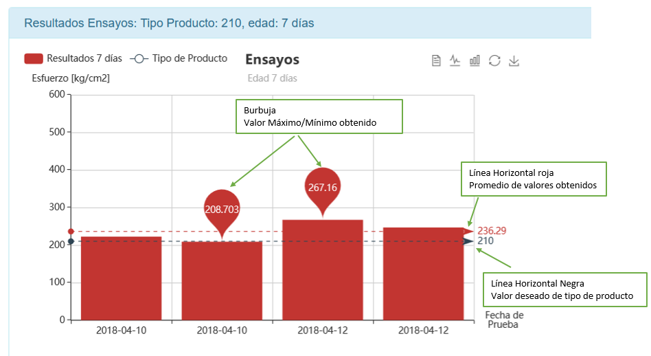 Fig 373 Gráfico de Ensayos de probetas de del tipo de producto de 210 con edad de 7 días para la orden actual seleccionada.