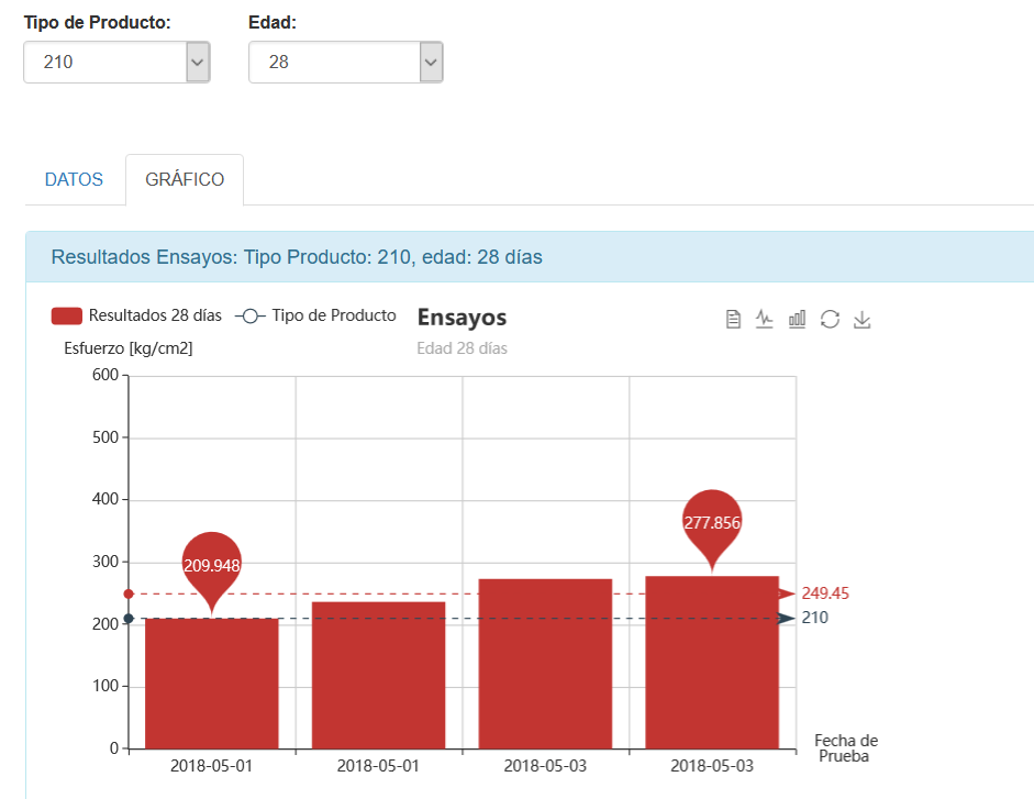 Fig 374 Gráfico de Ensayos de probetas de del tipo de producto de 210 con edad de 28días para la orden actual seleccionada.