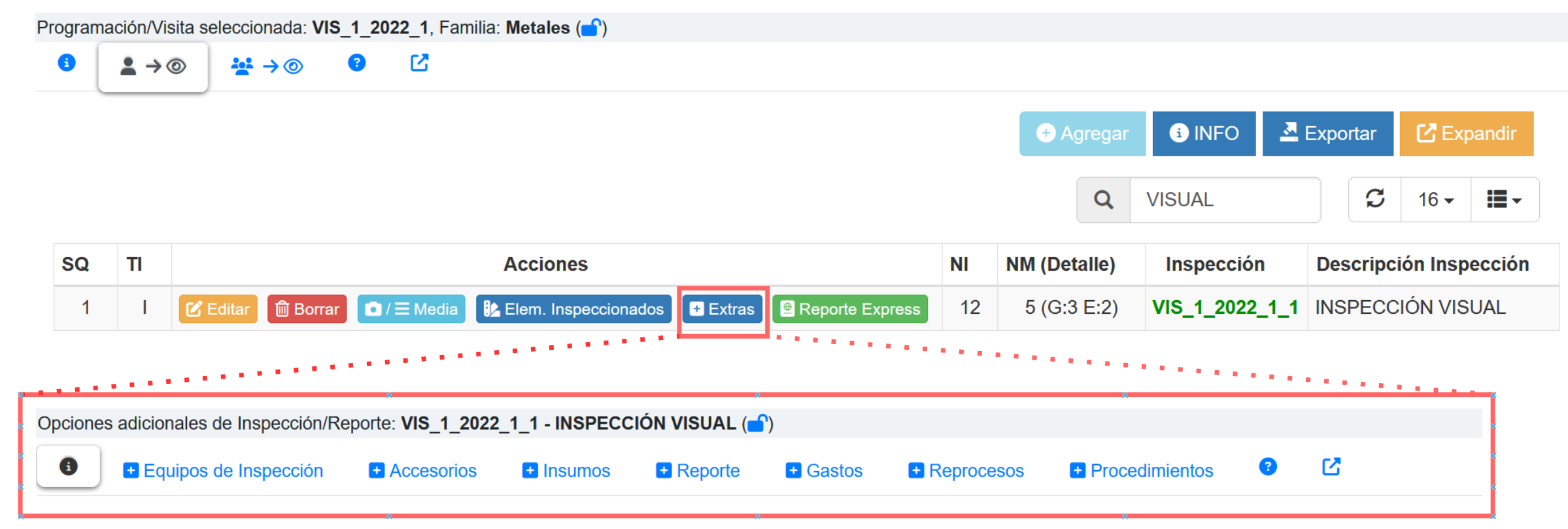 Fig 768 Extracto de pantalla indicando opción de mostrar/editar información extra de un determinado reporte de inspección en el sistema e-NDICC-ERP.
