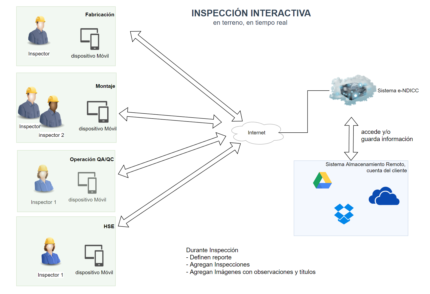 En otras palabras durante la inspección es posible contar con un reporte interactivo que refleje los resultados de la inspección el cual permite adjuntar y documentar las imágenes obtenidas durante la inspección. Esto se puede apreciar en la siguiente imagen, donde diversos inspectores pueden interactuar en linea con el sistema