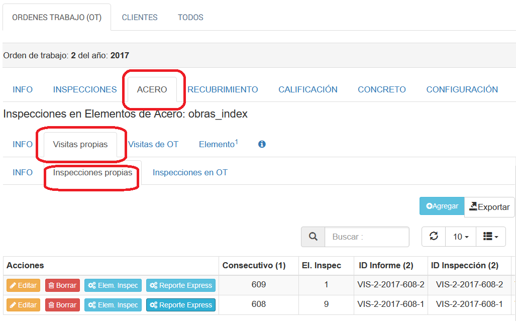 En este listado de Inspecciones Propias, cada registro tiene los siguientes items