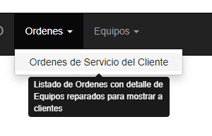 - Ordenes de Servicio del Cliente Muestra todas las ordenes del cliente seleccionado. Esta es la opci贸n que el cliente ver谩 cuando acceda al sistema. Ver m谩s detalles enOrden es de Servicio para el cliente