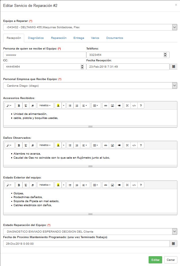 - Pestaña Recepción (si no hay variación debe ser lo misma que la orden, pero puede darse el caso que para un deteminado equipo que esta en la orden lo trajo otra persona en otro momento