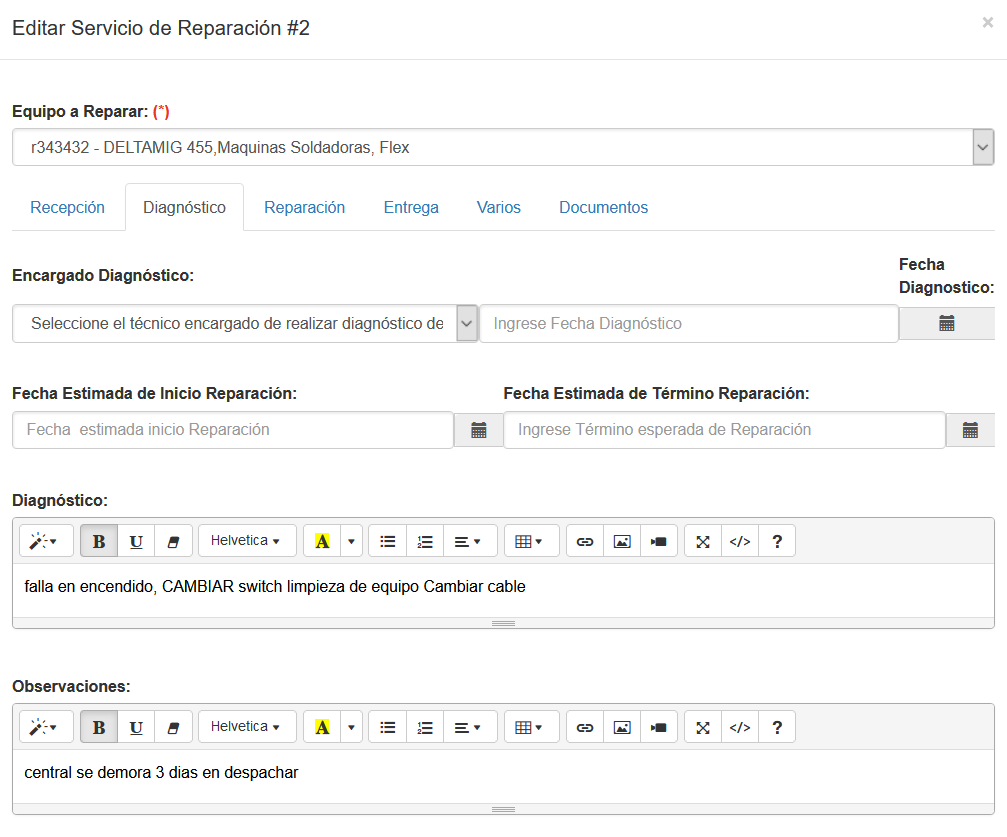 - Observaciones de Reparación, posee un campo texto que permite resaltar ítems