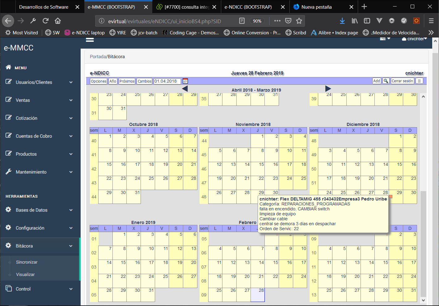 Asociar la información en una bitácora de tal manera que se puede ver eventos en forma gráfica, se puede programar actividades futuras y se podrá enviar sms a cliente en forma automática.