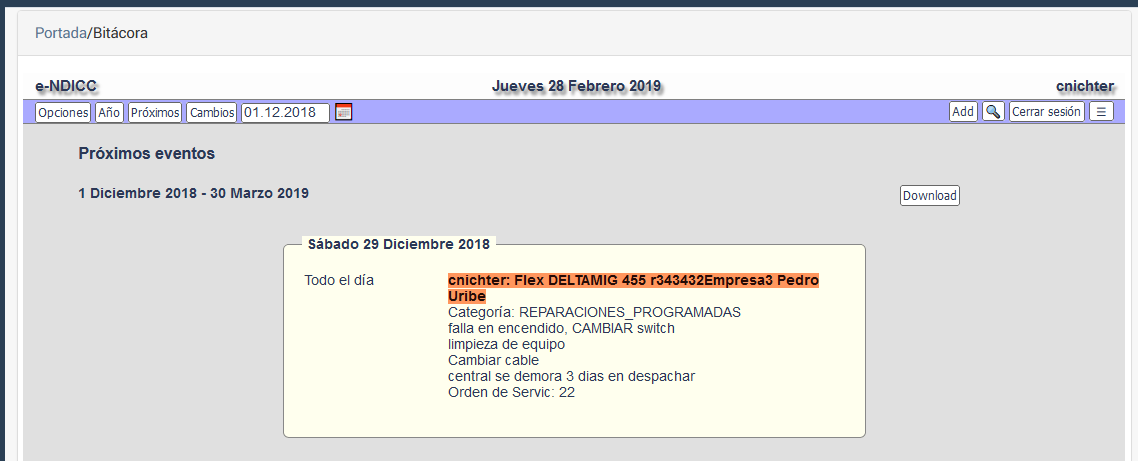- Fecha del próximo mantenimiento (esta fecha se emplea en la bitácora para programación de actividades y se esta trabajando para que se envíe SMS en forma automática.