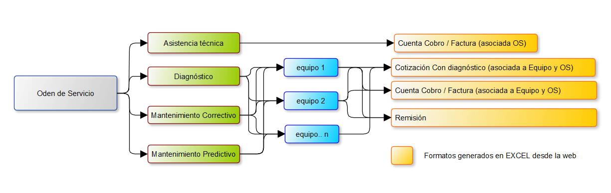 - Cuentas de cobro: asociar a la Orden de Servicio una cuenta cobro (no hay reparación y por ende referencia a una maquina) se usa básicamente en tipo de orden de servicio "asistencia"
