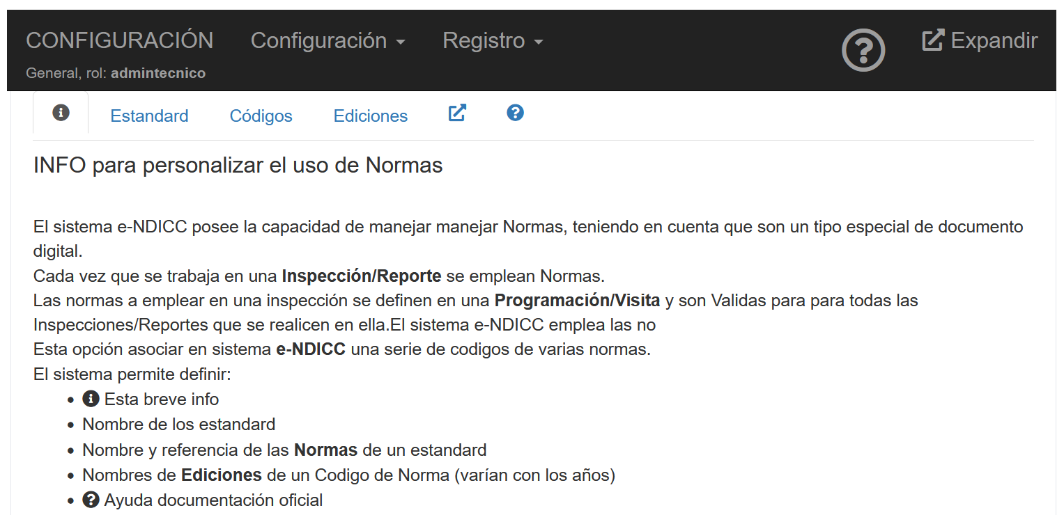 Fig 528 Extracto de pantalla, con menú de configuración opción Normas seleccionado.