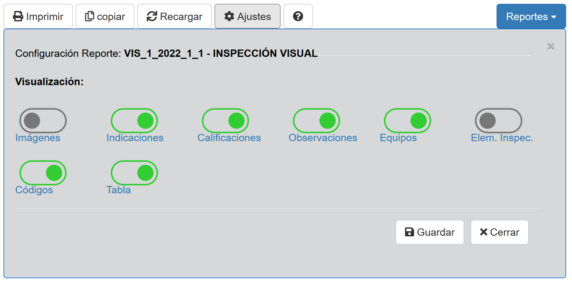 Fig 650 Detalle zona de Botones de Acción un reporte Express, con opción Ajustes activa