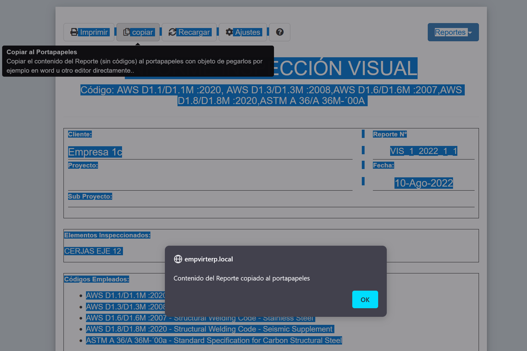 Esta opción permite copiar el contenido del reporte al portapapeles y con ello emplear esta información para pegarla en otra aplicación. Por ejemplo MS WORD, tal como se aprecia en la siguiente imagen.