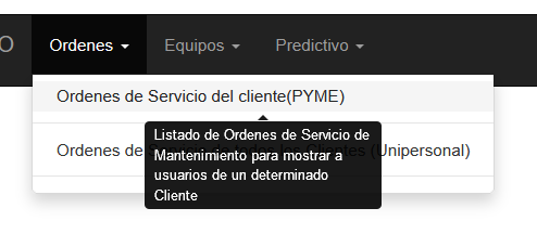 - Ordenes de Servicio del Cliente Muestra todas las ordenes del cliente seleccionado. Esta es la opción que el cliente verá cuando acceda al sistema.