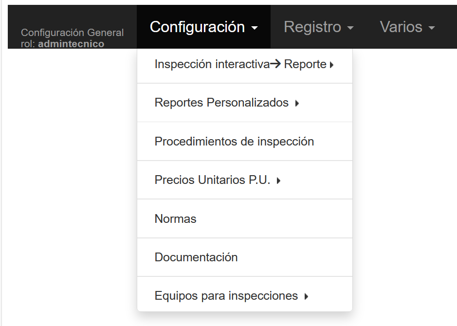 - Procedimientos de Inspección: Opciones para definir y manejar reportes de procedimientos empleados en sistema. Más detalles, ver Procedimiento de inspección