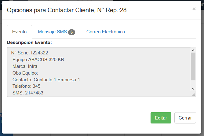 Con datos del Evento de Mantenimiento se prepara un sms para enviar al cliente. Ver información Envío SMS cliente - Correo Electrónico