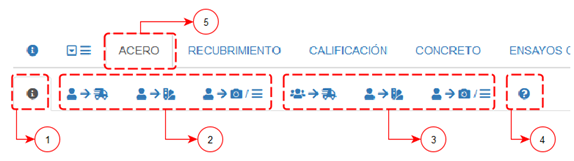 Una vez que se ha seleccionado una pestaña de las familias de inspección "Acero", "Concreto" y "Revestimiento", aparecerá un segundo nivel de pestañas tal como se muestra se muestra a continuación.