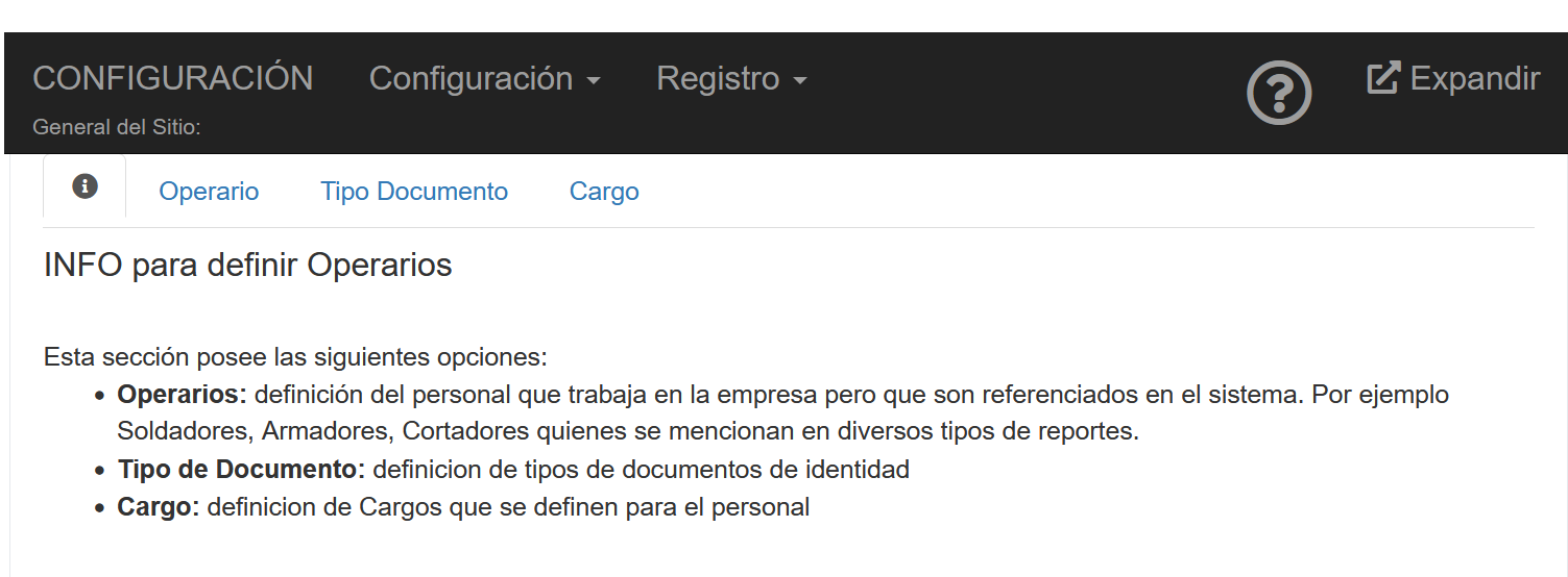 Fig 547 Extracto de pantalla, con menú de configuración opción Operarios seleccionada.